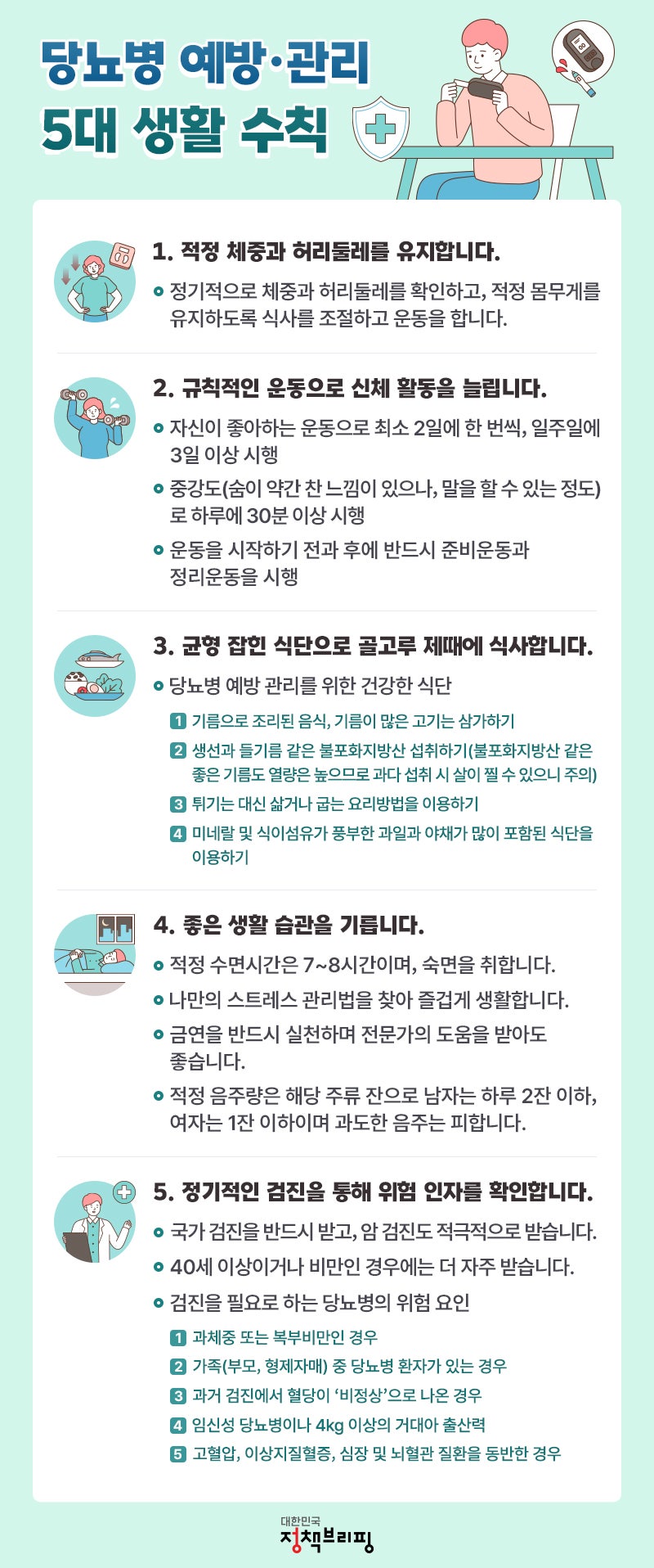 건강유지 5대 핵심요소 건강유지 5대 핵심요소는 다음과 같으며, 개인의 건강상태 및 생활방식에 따라 중요도의 순서가 달라질 수 있습니다.1. 균형잡힌 식단(30%) 다양한 음식을 섭취하여 좋은 영양을 유지하세요. 탄수화물, 단백질, 지방, 비타민, 미네랄 등 모든 필수 영양소가 균형 잡힌 식단을 섭취해야 합니다. 과일과 채소에는 비타민, 미네랄, 식이섬유가 풍부합니다. 건강을 유지하는 데 필수적입니다. 건강에 해로운 영향을 미칠 수 있으므로 가공 식품과 설탕 섭취를 제한해야 합니다. 2. 규칙적인 운동(25%) 유산소 운동을 하면 심혈관 건강 개선, 체중 관리, 스트레스 해소에 도움이 됩니다. 근육을 강화하고 뼈 건강을 개선하며 신진대사를 촉진하기 위해 근력 운동을 하세요. 유연성을 향상시키기 위해 가끔 스트레칭을 하십시오. 건강을 향상시키고 부상을 예방하는 데 도움이 됩니다. 3. 충분한 수면 (20%) 성인은 하루 7~8시간의 수면이 필요하다고 합니다. 면역력 강화, 인지기능 개선, 스트레스 해소에 도움을 줍니다. 규칙적인 수면 패턴을 유지하고 매일 같은 시간에 잠자리에 드는 것이 중요합니다. 아침에 일어나도록 노력하세요. 조용하고 어두우며 적절한 온도의 환경에서 잠을 자도록 노력하세요. 4. 스트레스 관리(15%) 스트레스를 유발하는 요인을 식별 및 제거하거나 이에 대처하는 방법을 배웁니다. 명상, 요가, 심호흡 등 스트레스 해소 활동을 즐겨보세요. 충분한 휴식을 취하여 스트레스를 줄이세요. 5. 금연 및 과음 제한(10%) 흡연은 폐암, 심혈관 질환 등 다양한 질병의 위험을 증가시킵니다. 과도한 음주는 간 손상, 뇌 손상, 심혈관 질환 등 다양한 질병의 위험을 증가시킵니다. (오늘 카카오톡으로 받은 메시지)