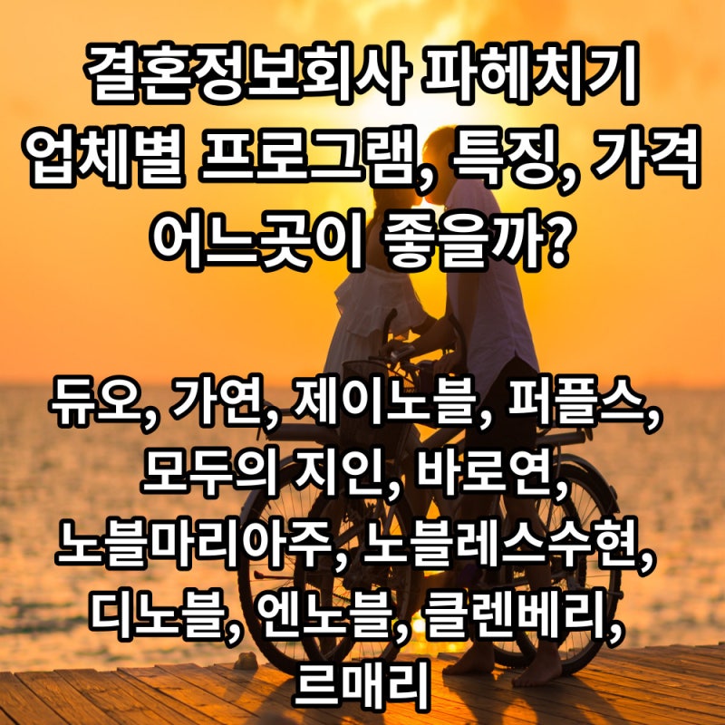 결혼정보회사는 정말 많습니다. 중매업체마다 가격이 천차만별입니다. 결혼정보회사마다 이용조건이나 운영방법도 다르다.