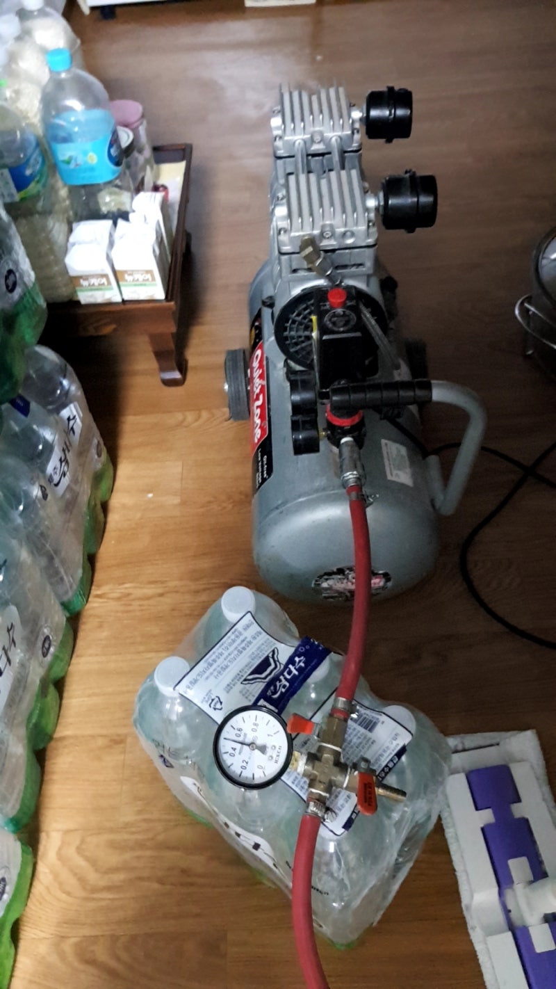 그런데 온수배관에 공압을 가하니 압력이 조금씩 낮아지는 것을 발견했습니다. 에어컴프레서로 5kg 정도에 압력을 가했더니 4kg 정도까지 서서히 내려가는 걸 볼 수 있었어요. 온수배관 어딘가에 손상이 있어서 배관 일부가 파손되었습니다. 공기가 새고 있는 것이 분명해 보였다.