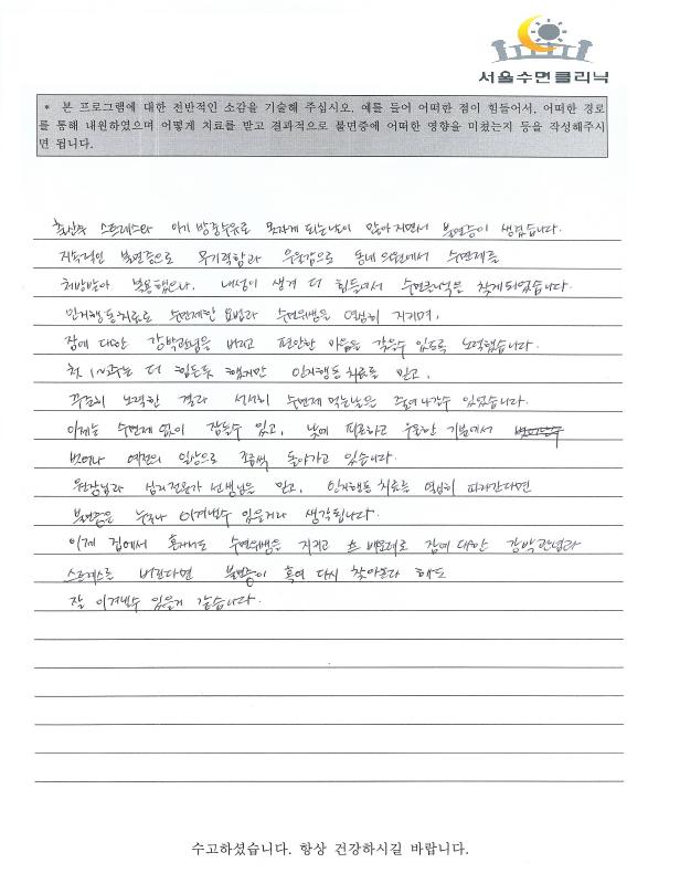 심용섭십장생한의원서울특별시 서초구 강남대로89길 18 2층 심용섭십장생한의원예약 논현역4번출구09:00-08:00일요일휴무0507-1477-5592 논현역 4번출구 도보5분거리에 위치한 심용섭십장생한의원      광고 후 계속됩니다.     다음 subject author   취소   #심용섭십장생한의원 #한의원 #불면증 #안면비대칭 #두리본요법 재생  0 좋아요  0 좋아요   공유 하기                     0:00:00    재생    음소거         00:00  00:00 실시간     설정    전체 화면      해상도 currentTrack   자막 사용 안함  재생 속도 NaNx   해상도    자막 설정   사용 안함      옵션  글자 크기    배경색    재생 속도   0.5x 1.0x (기본) 1.5x 2.0x            알 수 없는 오류가 발생했습니다.                             도움말 보기                       음소거 상태입니다.             도움말                    라이센스         고화질 재생이 가능한 영상입니다.설정에서 해상도를 변경해보세요. 더 알아보기 0:00:00             #심용섭십장생한의원 #한의원 #불면증 #안면비대칭 #두리본요법 여기 한의원 맞나요?정원이 너무 예쁘게 꾸며져 있고가정집 같은 아늑한 분위기라 너무 좋았어요예약을 하고 방문했더니 슬리퍼도 미리 꺼내져 있어요센스 대박!!  한의원이라고 해서 한약 냄새가 많이 날줄 알았는데냄새가 하나도 안나더라고요기력회복에 좋은거랑 기관지에 좋은 오미자차를 준비해주셨어요오미자차가 새콤달콤하고 정말 시원해서 좋았어요  심용섭십장생한의원에 문진표에요꼼꼼하게 작성해주시면 진료에 도움이 된다고해요 Previous imageNext image 기력회복에 좋은 가루는 물이랑 삼키면 되요오미자차는 빨대를 꼽아 드시면 편하게 드실수 있으세요문진표 작성하면서 먹으니 시간 빨리갔어요  심용섭십장생한의원 진료비는 비급여치료는 5만원이라고해요보헙급여 진료는 보험혜택받으실수 있다고하셔서 참고하세요 문진표 작성후 혈압을 재고 인바디를 측정해요혈압도 보통 한쪽팔만 측정하는데심용섭십장생한의원에서는 양팔을 꼼꼼하게 측정해주셨어요한의원에 인바디가 있어서 신기했어요문진표 작성 – 혈압 – 인바디측정 – 원장님진료- 치료  임신때부터 지금까지 육아하면서 깊은 잠을 못자고 낮잠도 잘못자는편이에요 오늘은 두리본 요법이란 치료로 불면증치료를 진행한다고해요1층에서 원장님 진료후 2층으로 올라가서 치료를 진행해요한의원이 2층으로 되어있어서 생각보다 크고 넓었어요  심용섭십장생 한의원 불면증치료두리본요법으로 치료를 진행하는데두리본요법은 수기요법으로 진행되요낮잠을 못자는 사람도 손으로 막힌 경혈부위를 풀어주면저절로 잠에 빠지게 된다고해요  설마 잠에 들까 했는데 저도 모르게 깊은잠에 빠졌어요잠깐사이에 푹자고 일어난 기분이에요너무 신기해서 진료끝나고 남편 예약도 바로 잡은거 있죠??베드에 누워서 이마, 목뒤, 눈썹, 얼굴 마사지를 섬세하게 해주세요 손으로 막힌 경혈을 풀어주시는데경혈만 풀어도 불면증에 도움이 되서 낮잠을 잘 수 있다고해요저는 낮잠을 못자는 편인데 잠이 올까 싶었어요마사지 받으면서도 잠이 안올꺼 같았는데 눈떠보니 저도 모르는 사이에 깊은 잠을 잤나봐요너무 꿀잠잤고 편안했고 이렇게 깊이 잠을 잔게 얼마만인지  불면증치료 고민중이시면 꼭 방문해보세요마법처럼 잠들게 되더라고요아직도 믿을수 없네요 낮잠을 잔게 너무 신기했어요교정기도 주셨는데 교정기를 끼면  얼굴비대칭교정에 도움이되어서 불면증도 도와준다고해요집에갈때 오미자차도 하나더 넣어주시고편지까지 써 있어서감동받았어요심용섭십장생한의원 꼭 방문해보세요저는 남편 데리고 재방문하려고해요