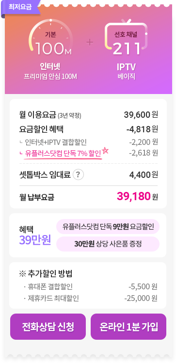 또한, 한국에 넷플릭스 캐시 서버를 보유함으로써 다른 회사보다 더 빠르고 안정적으로 넷플릭스를 시청할 수 있었습니다. 인터넷TV를 요청하시면 라우터도 무료로 대여해 주실 수 있었습니다. 다른 회사의 경우 월 1,100~2,200원 정도 듭니다. LG는 고출력 스피커 8개를 탑재한 사운드바 셋톱박스를 제공했다. (사운드바 블랙 : 월 6,600원) 이러한 장점이 제가 LG IPTV를 선택하게 된 이유입니다. 단점은 지역이나 환경에 따라 다릅니다. 인터넷 품질이 저하될 수 있다는 문제가 있다. 인터넷 연결선은 대칭형과 비대칭형으로 구분됩니다. 대칭형이 비대칭형보다 품질이 좋습니다. 하지만 KT를 제외하면 LG, SK 등은 대칭형 인터넷이 아직 100% 보급되지 않았다. 따라서 지역에 따라 인터넷 품질이 좋지 않을 수 있습니다. 따라서 인터넷 설치시에는 대칭형인지 아닌지 꼭 확인하시기 바랍니다. 계획 요약 요약 < LG > 3년약정 / 인터넷+휴대폰결합 표준인터넷 100MB 인터넷 500MB 인터넷 1GB 기본 212ch 33,000원 34,100원 36,300원 프리미엄 255ch 37,400원 38,500원 40,700원 프리미엄 라이트 260ch 39,600원 40,700원 42,900원 < KT > 3년약정 / 인터넷+휴대폰결합 인터넷 100MB 인터넷 500MB 인터넷 1GB 기본 236ch 31,900원 37,400원 42,900원 라이트 240ch 33,000원 38,500원 44,000원 에센스 266ch 36,300원 41,800원 47,300원 < SK > 약 3년 정 / 인터넷+휴대폰 복합 인터넷 100MB 인터넷 500MB 인터넷 1GB 이코노미 184ch 30,800원 35,200원 38,500원 표준 226ch 34,100원 38,500원 31,900원 ALL 252ch 37,400원 40,700원 45,100원 위 표는 IP를 나타냅니다. 통신 3사의 TV . 요금제 요약 다양한 요금제가 있지만 가장 대표적인 요금제를 통신사 3종으로 나누어 보았습니다. 가격이 올라갈수록 시청할 수 있는 채널 수가 늘어납니다. 실제로는 사람들이 평소에 즐겨보는 채널만 시청하기 때문에 기본적인 계획은 이 정도면 충분하다고 생각합니다. 실제 통계를 보면 90% 이상이 저렴한 기본요금제를 이용하고 있었습니다. 게다가 LG는 다른 회사와 달리 디즈니, 넷플릭스 요금제를 갖고 있었다. 이용하시면 할인을 받으실 수 있어요! 프리미엄 디즈니 플러스 월 24,600원2,000원 절약Premium Netflix HD (Netflix Standard) 월 27,800원 (최대 2개 디바이스 / HD 화질) 2,200원 절약 가능 Premium Netflix UHD (Netflix Premium) 월 31,300원 절약 가능 ( 최대 4개 / UHD 화질) 2,200원 절약 가능 < Tips > 프리미엄 18,700원인 LG 제휴요금제를 이용하시면 할인을 받으실 수 있습니다. 플랜(프라임라이트) 기준 3,300원 할인된 가격입니다. 그래서 값비싼 TV 요금제가 불필요하다고 느껴진다면 추가 13,500원의 넷플릭스 스탠다드를 Basic의 경우 12,100원에 가입하고, 25,600원의 더 저렴한 가격으로 이용하시면 됩니다. (베이직 이용시 디즈니+도 더 저렴합니다.) LG IPTV 신청 시 더 많은 혜택을 받는 방법 그동안 LG IPTV 신청 시 꼭 알아두셔야 할 정보를 정리해보았습니다. LG U+에 가입하기로 결정하셨다면, 주의 깊게 알아보고 어디에 지원해야 하는지 알아보세요. 당신은 선택해야합니다. 통신사를 선택하는 기준은 개인마다 다르지만, 회사를 선택하는 기준은 당연히 현금선물이었다. 온라인으로 신청하는 방법은 크게 3가지였습니다. 받으실 수 있는 현금선물에 차이가 있었습니다. 본사 > 상품권 및 각종 사은품 제공 오프라인 대리점 > 고객 유치 금액에서 임대료 및 인건비를 공제한 금액을 현금선물로 제공 온라인 대리점 > 고객 유치 수당을 상품공지시스템 한도 내에서 현금선물로 지급 47만원 온라인 대리점을 통한 설치가 현금선물을 받는 가장 좋은 방법이었습니다. 이것은 많은 돈을 벌 수 있는 방법입니다. 하지만 사은품을 주겠다고 하고도 지체하거나 지불하지 않는 회사는 반드시 피해야 합니다. 인잘알은 ‘신뢰’와 ‘정직’을 바탕으로 모든 고객에게 서비스를 제공합니다. 설치 당일 최대 현금선물을 주고 받으실 수 있습니다. .LG IPTV 가입처를 찾고 계시다면 인잘커뮤니케이션즈에 문의하시는 것이 좋을 것 같습니다. LG IPTV U Plus 가입에 대한 생각입니다. 47만원 사은품 받을 수 있는 노하우! 인터넷TV를 자세하게 비교해보고 가입했어요. 인터넷TV를 꼼꼼히 비교해본 후 가입했습니다. LG IPTV 사은품 혜택에 대한 자세한 내용을 확인하시려면 아래 링크를 클릭하세요. 인잘통신 고객센터 1566 – 4736 365일 오전 9시부터 오후 10시까지 상담 가능